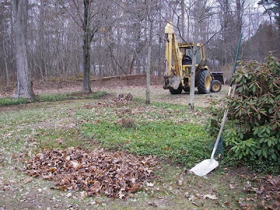 While raking one of the large periwinkle gardens I decided we might as well REALLY clean it up and remove all the old stumps, rocks, and a couple of errant growing nuisance trees. Dave was ecstatic to be able to do some digging (aka scraping) and hauling away the old roots.